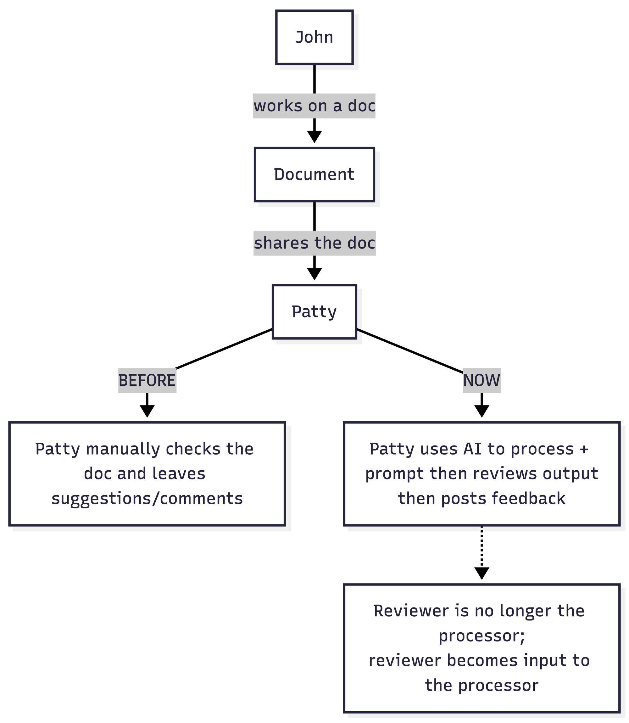 The human became a translation layer between organization and machine reasoning. We could essentially call the new workflow: “Prompt-mediated collaboration”